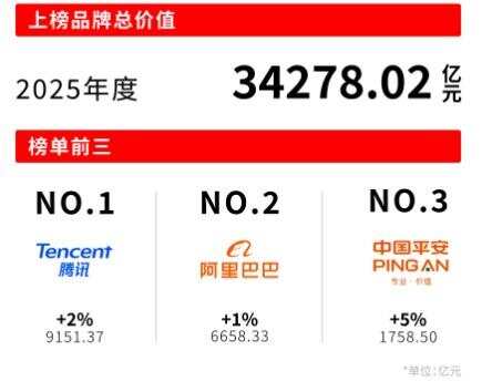 2025年度上榜品牌总价值为34278.02亿元,较2024年度实现1.68%的小幅增长,释放品牌持续发展的积极信号。记者梳理榜单发现,腾讯以9151.37亿元的品牌价值持续领跑榜单,阿里巴巴以6658.33亿元的品牌价值位列第二;中国平安则凭借1758.50亿元的品牌价值与5%的价值增速,较2024年度排名提升一位,跻身本年度榜单第三。